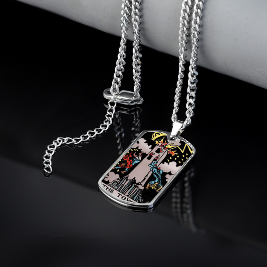 The Tower Tarot Card Double Sided Print Rectangular Pendant and Necklace