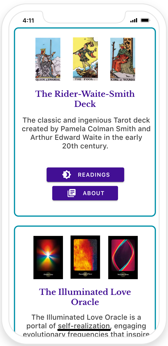 ~ Multiple reading types including Single Card, Past-Present-Future, and Relationship.
