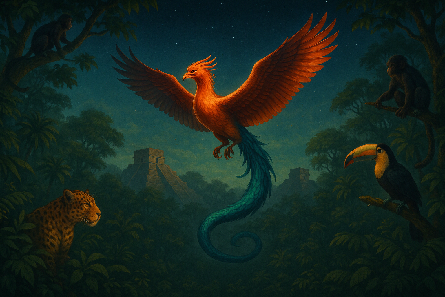 High-quality printing brings the warm copper feathers and teal serpent tail to life against the deep jungle blues
